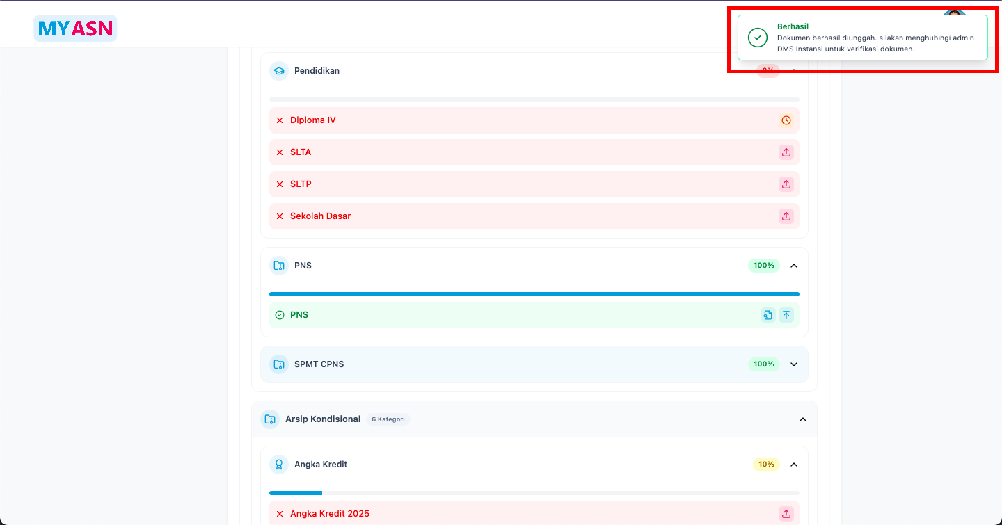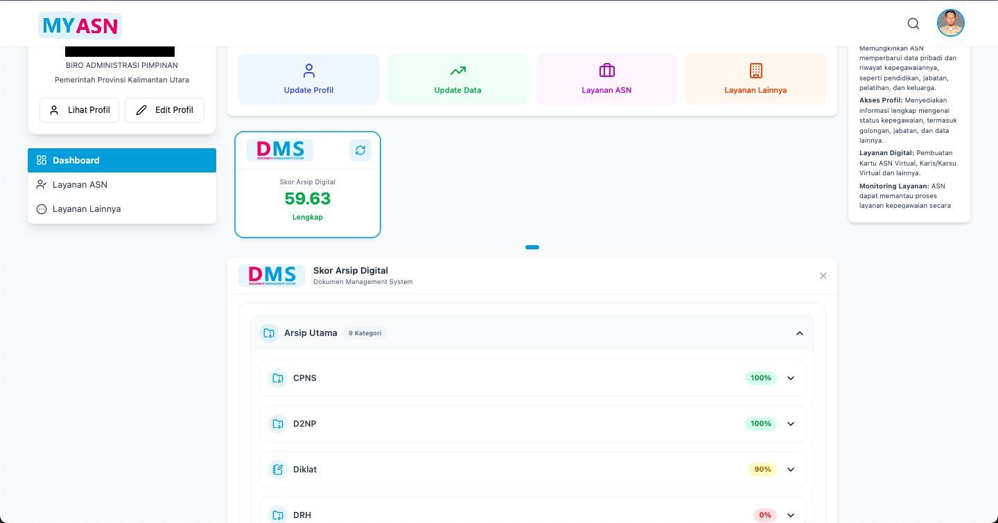 Untuk memantau kelengkapan dokumen kepegawaian yang telah diunggah dan disinkronisasi dengan system MyASN, DMS memiliki fitur Skor Kelengkapan Arsip Digital. Skor kelengkapan arsip ini dihitung secara otomatis di mana setiap jenis Arsip ASN memiliki skor arsip dengan rentang skor 0 – 100 yang terdiri dari Skor Arsip ASN Utama dan/atau Skor Arsip ASN Kondisional.