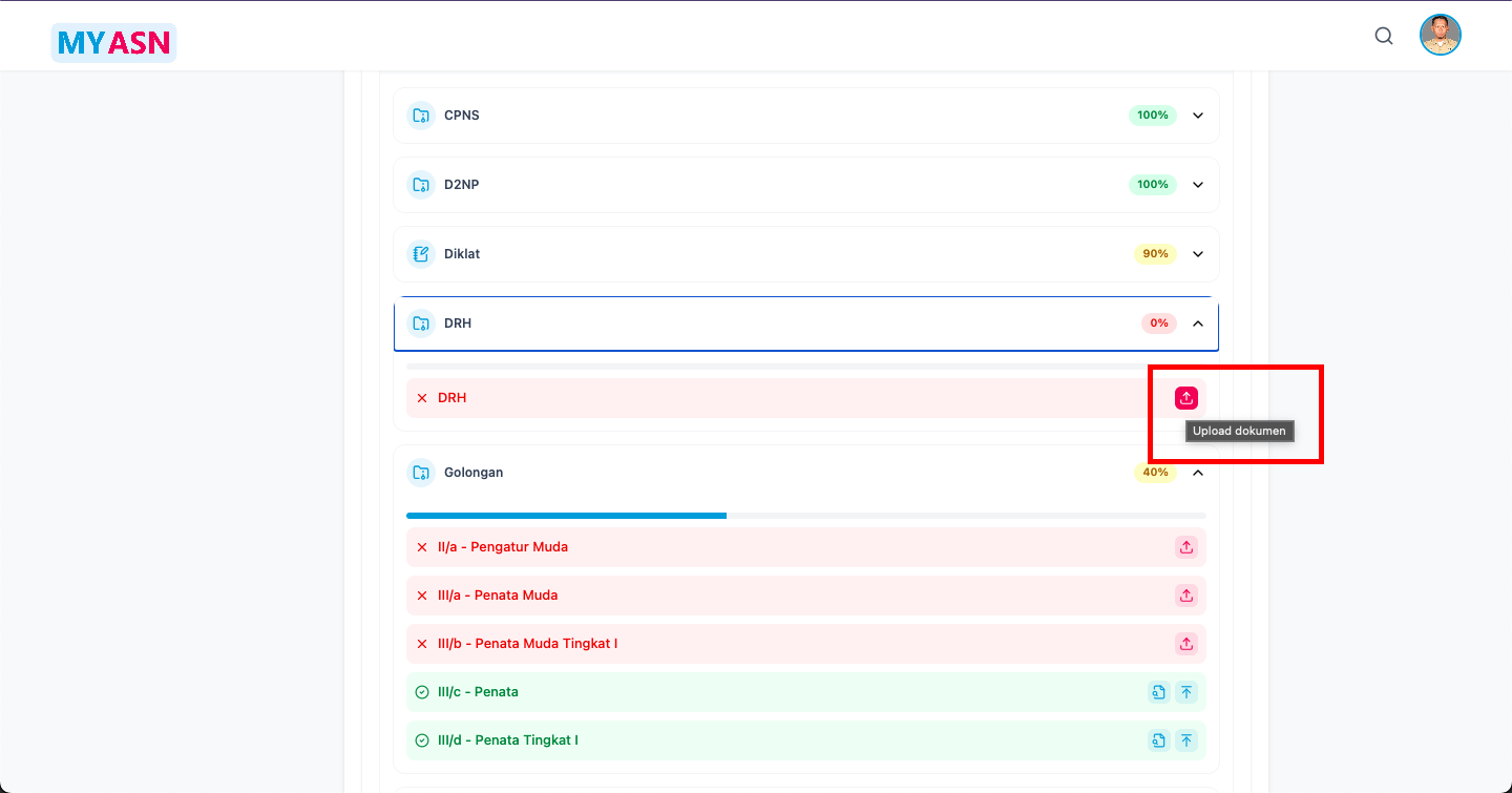 Untuk menambahkan arsip digital dimaksud, pada tampilan kelengkapan arsip terdapat fitur unggah, sebagai contoh adalah proses unggah untuk Daftar Riwayat Hidup (DRH) Pegawai. Sebelumnya, perlu kita ingat bahwa DRH yang dimaksud adalah DRH yang dihasilkan dari MyASN, dapat diakses melalui laman utama Dashboard MyASN.